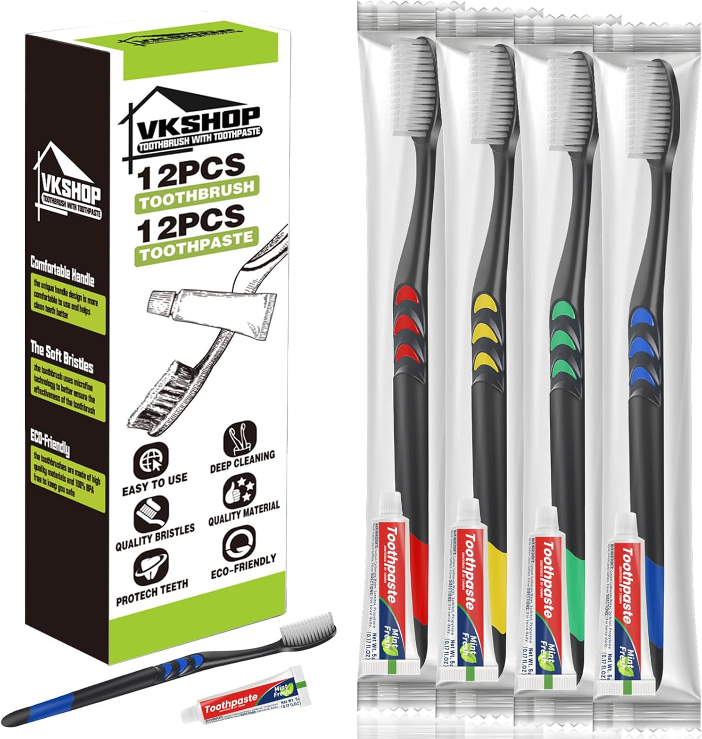 • 【Cost-effective】 VKshop120 individually wrapped bulk toothbrushes and 120 bulk toothpastes, affordable, whether it is a family hoarding, or hotels, B&B bulk purchases, are very cost-effective, do not have to worry about the use of a few times is gone