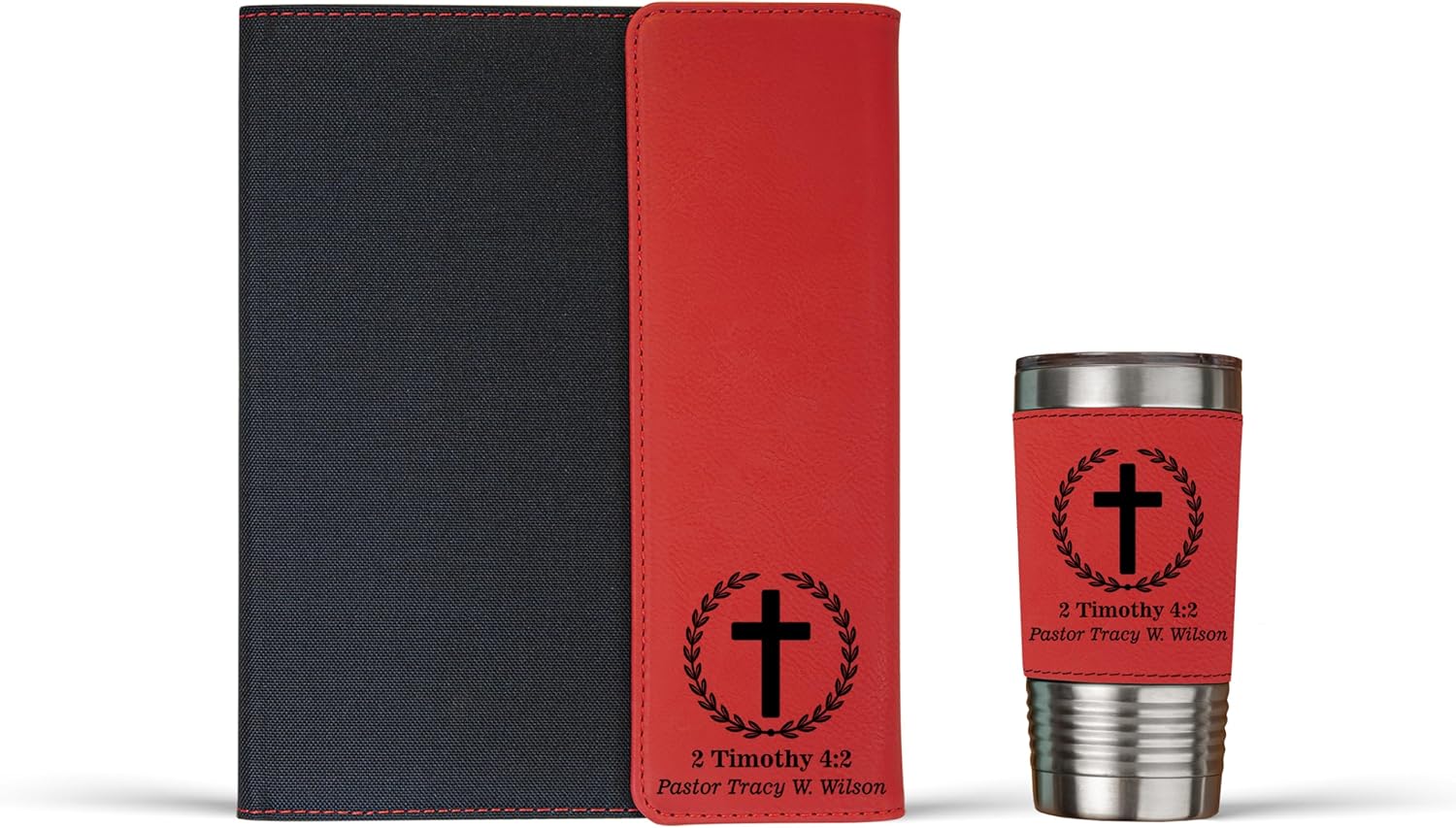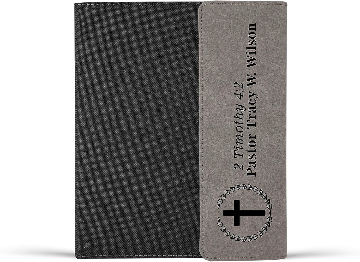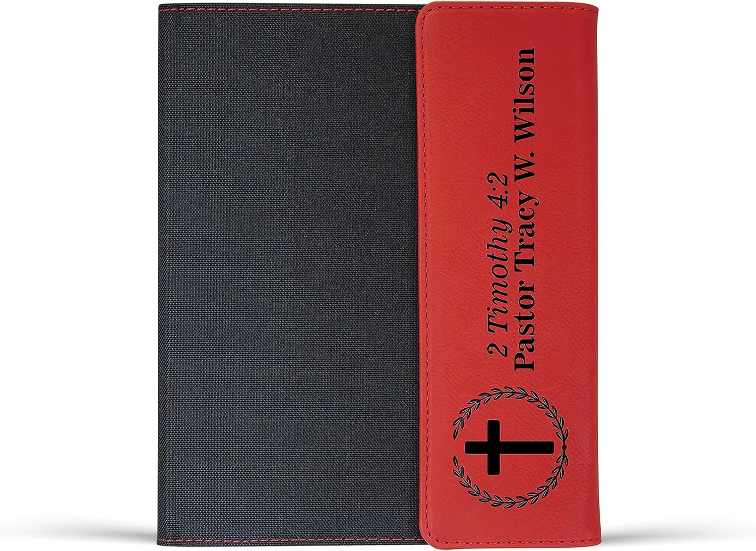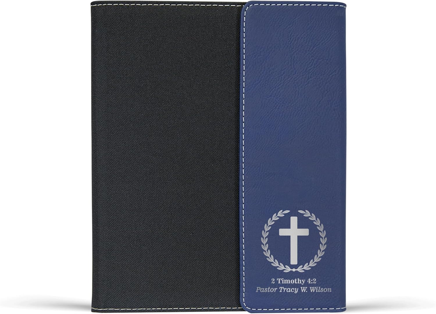 Express your heartfelt appreciation for the dedicated religious leaders who have gone above and beyond for their congregation with our Personalized Pastor's Portfolio . It's the perfect gift for special occasions, pastor appreciation events, ordination ceremonies, or end-of-season celebrations. This thoughtful set is a meaningful way to say thank you and honor their unwavering commitment and spiritual guidance. It's sure to make any pastor feel valued and respected. PERSONALIZED AND INSPIRATIONAL - Customize the portfolio with the pastor's name, creating a one-of-a-kind gift that is sure to make them feel special. Engraved with a meaningful Bible verse # of your choice, this portfolio set serves as a reminder of their spiritual leadership and dedication. Available in 6 color options to match their unique style or church decor. ORGANIZE LIKE A PRO - Inside the portfolio, you'll find a 50-sheet lined notepad, a pocket for important documents, and an elastic loop for the included pen. This padfolio provides pastors with a professional all-in-one solution to keep their sermon notes, inspirational messages, counseling materials, and important papers in one place, whether they're in the church office or on the go. STYLISH AND DURABLE - Combining a canvas body with a leatherette fold-over magnetic closure, this portfolio exudes sophistication and professionalism, making it an accessory that pastors will be proud to carry. Made from high-quality materials and built to withstand the demands of their ministry, it's easy to clean, ensuring it stays in excellent shape for everyday use. Surprise your pastor with a gift that truly reflects their exceptional dedication. Our Pastor's Portfolio is the perfect way to show your gratitude and appreciation. With its personalized touch and inspirational design, this set is a cherished keepsake that serves as a constant reminder of the positive impact they make in spreading God's word and caring for their congregation.