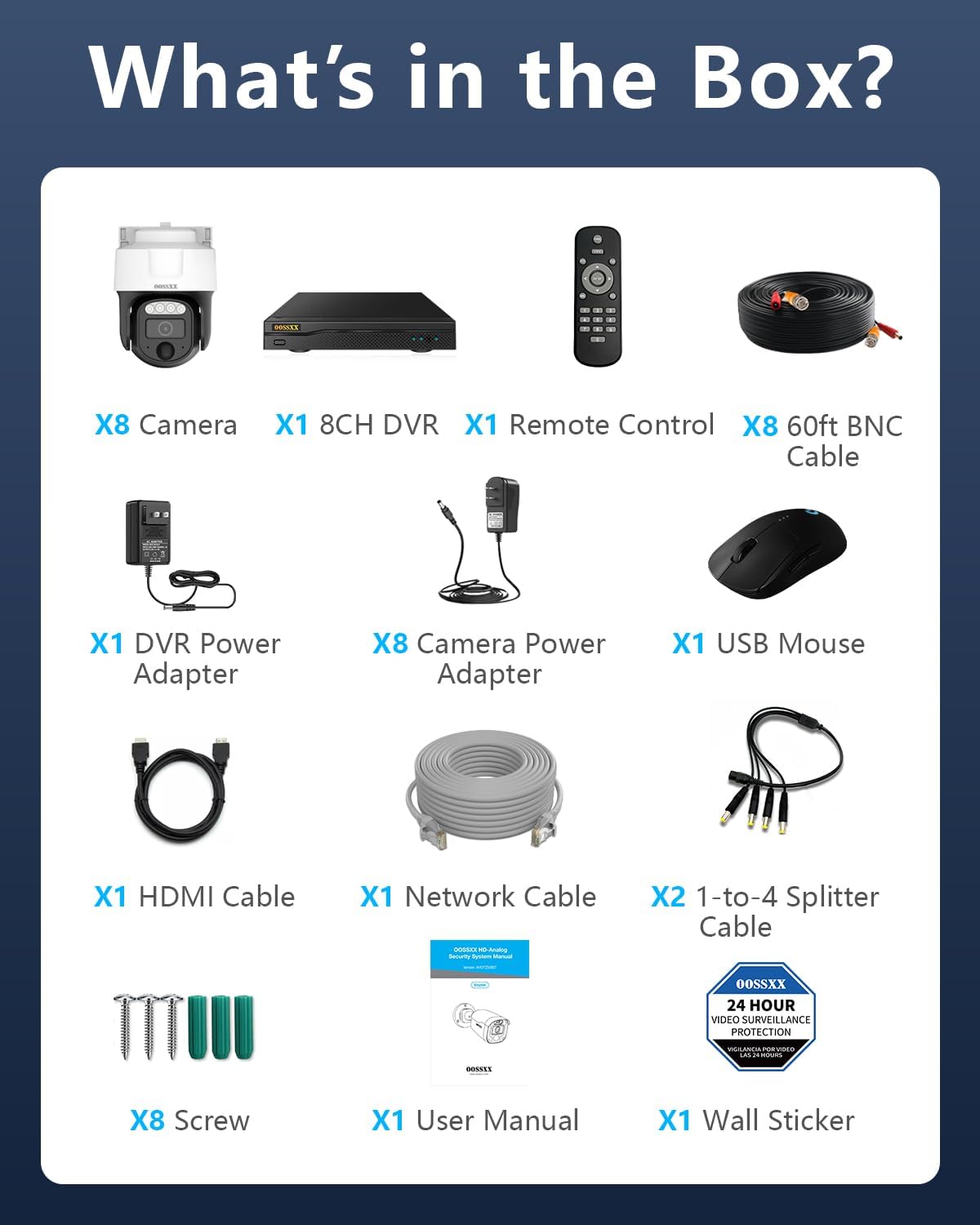 | BuiltIn Media | 2-in-1 Cable 60ft for Camera x 4, 8-Channel 5.0MP DVR Pre-install 1TB Hard Drive x 1, PIR PTZ Wired HD-Analog 4K/8MP Camera x 4, Remote x 1, USB Mouse x 1 |