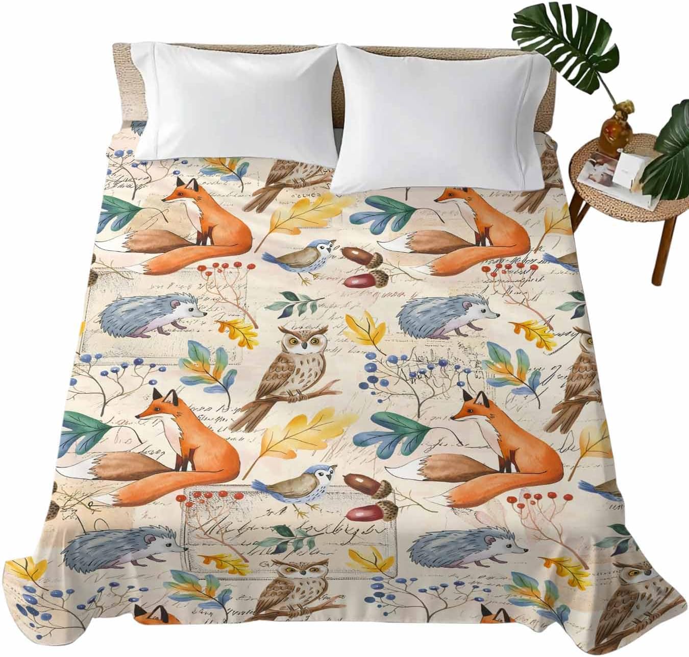 King Flat Sheet, Fall Leaves King Bed Sheets Only, Soft Microfiber Flat Sheet, Autumn Thanksgiving Fox Hedgehog Owl Retro Hotel Quality Bedding Top Sheet Bedroom Home Dorm Decor